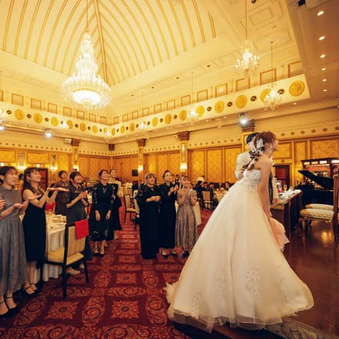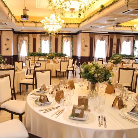 大勢のゲストを迎えることができる大空間に、ゴールドとホワイトを基調にした上質なインテリアが丁寧に施されています。