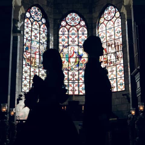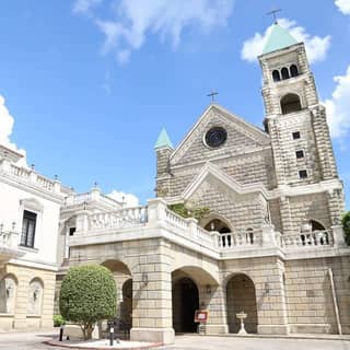 天井が高く開放的な空間に、県内最大級の美しいステンドグラスから神秘的な光が降り注ぎます。