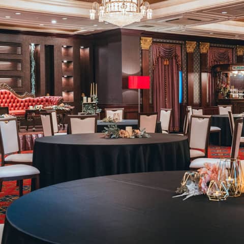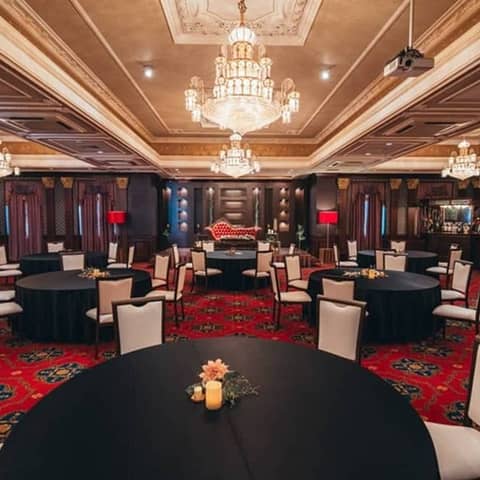 本館2F披露宴会場イルパラッツォ。シックな大人の空間がゲストをおもてなし。2次会場としても利用可能。映像・音響(カラオケ含む)利用も可能です!